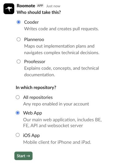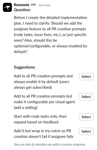 Please note that you can't call specific agents by name. When you use @Roomote, you're mentioning the Roo Code Slack App, which handles the integration. That's why the app will ask you to pick an agent.